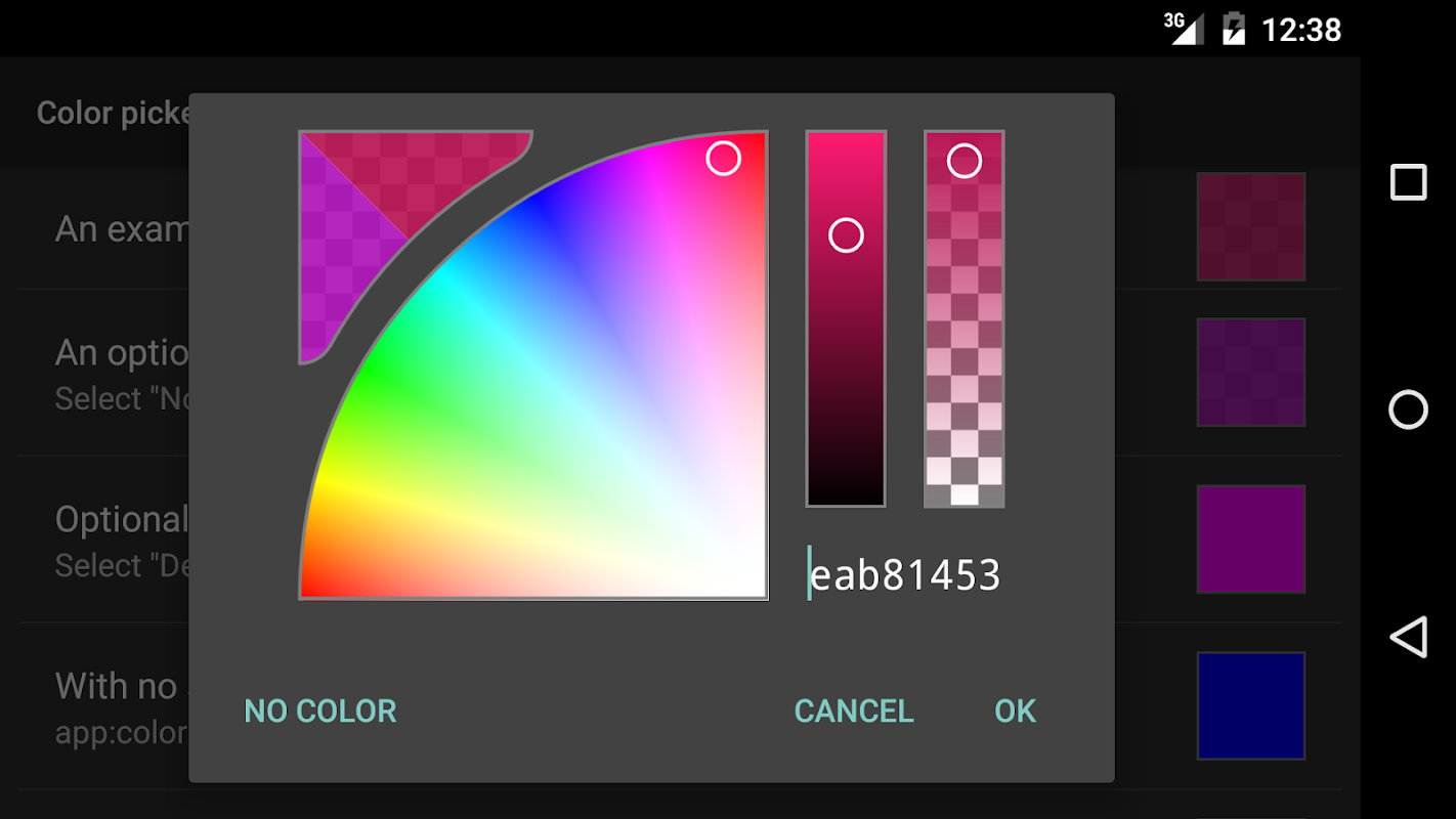 Diese App zeigt eine Farbauswahl Bibliothek, die eine ColorPreference und einen ColorPickerView mit Farbton / Sättigung / Wert / alpha-Auswahl, sowie eine Hex-Farbeintrag zur Verfügung stellt. Ausführliche Informationen finden Sie auf der GitHub-Seite des Projekts: