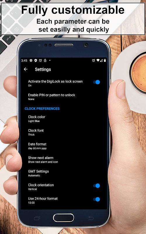 • Die App zeigt eine extra große Digitaluhr auf Ihrem Sperrbildschirm an.