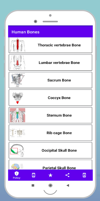 Human Bones Name und Bild mit Informationen, die Sie aus dieser App kennen und lernen können. Dies ist ein Leitfaden für Bildungsanwendungen. Liste der Knochen im menschlichen Körper und Arten von Skeletten. Lernen Sie die Anatomie des Skeletts.