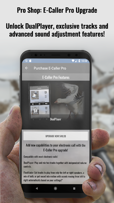 • Besuchen Sie den Pro Shop, um Zugang zu der Bibliothek mit bewährten, effektiven Schneegans-Sounds von Snows Down Low zu erhalten, und das E-Caller Pro-Upgrade, um exklusive Tracks und erweiterte Sound-Control-Funktionen im E-Caller freizuschalten!