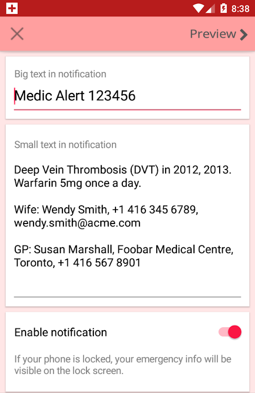 EIS. Lock tut dies, indem es Ihre Notfallinformationen als fortlaufende "Benachrichtigungen" anzeigt, genau wie diejenigen, die für eingehende E-Mails, SMS usw. verwendet werden. Aber diese Benachrichtigung ist immer da – sie wird nicht verschwinden, es sei denn, Sie deaktivieren sie. Und es bleibt aus dem Weg und verwendet eine niedrigere Prioritätseinstellung als andere Benachrichtigungen.