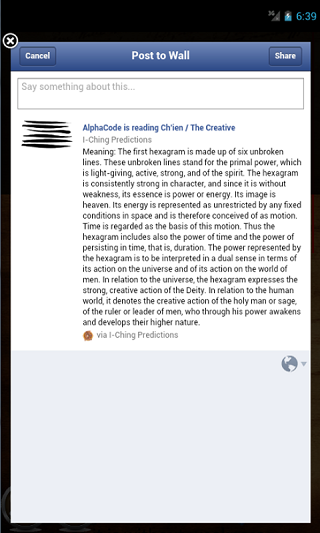 With this app you can share with your friends via facebook the hexagram given by the I Ching