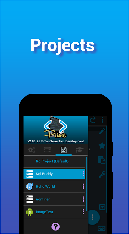 • Projects: a quick and easy way to group files together for Web IDE, Node.js, DroidScript, Python, and Ruby development