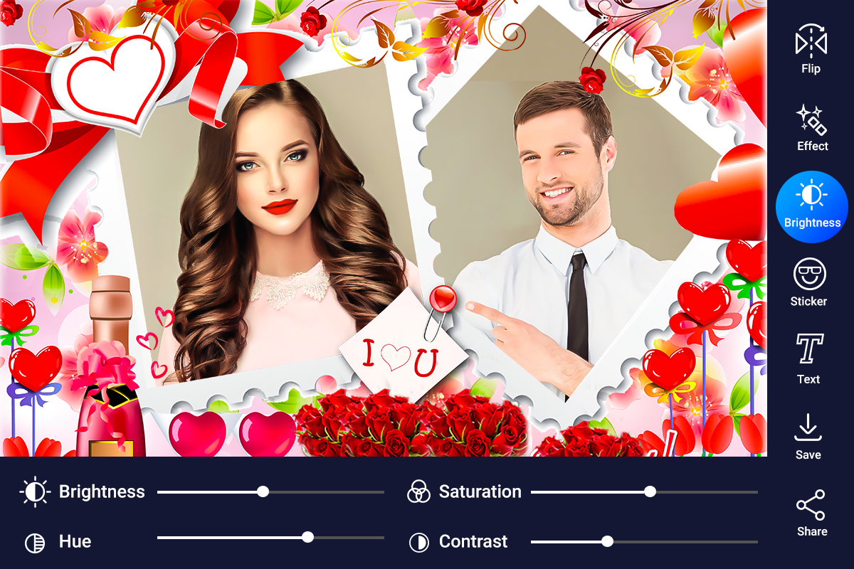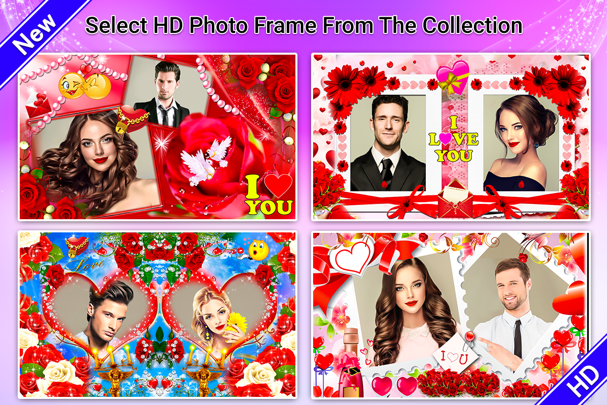 ☻ You can set Dual photos of your and yours love forever in frames to make romantic I Love You / love : photo frame. You can also either edit your photos with frames and other photo effects, by selecting photos from mobile gallery or you can use to click photo directly along with the frames.