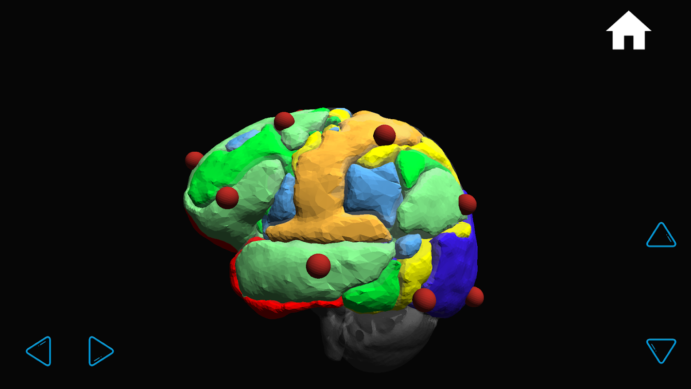 iBraiNEEG (intrinsic Brain Networks and EEG electrodes) application: The user view a 3D transparent brain with 7 standard functional connectivity networks and EEG 10-20 electrodes as red spheres over the brain. The user could rotate the brain using onscreen controls, and by tapping each electrode, the name of it appears on screen. By tapping the three points at the left side of the screen, the name of each functional network will appear.