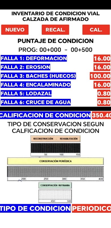 Darüber hinaus können Sie mit der Anwendung für jeden Schaden oder jede Verschlechterung den Schadens- oder Verschlechterungsgrad berechnen, der auf einer Straße bewertet werden kann, und so den Grad der erforderlichen Eingriffe berechnen, sei es auf der Ebene der routinemäßigen Wartung, der regelmäßigen Wartung oder Rehabilitation.