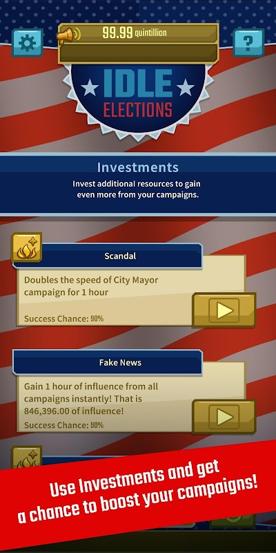 Welcome to Idle Elections! Idle game about politics, wealth and influence. Start your career in politics competing for a local City Major and end it up as a Solar Emperor to rule this part of the Universe.