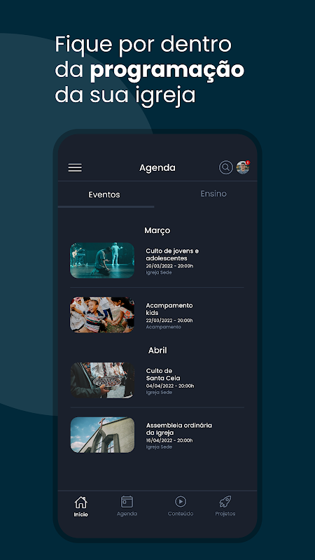 In der Anwendung verfügbare Ressourcen: Nachrichten, Agenda der Kirche, Veranstaltungen, Inhalte, Projekte, Live-Übertragung und Lehrmodul.