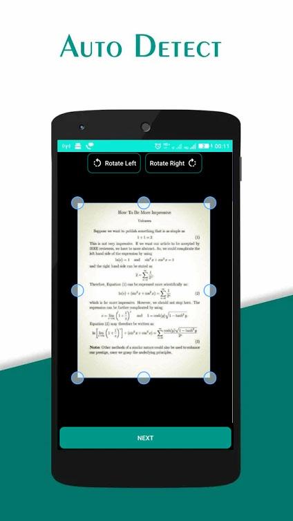 * Der intelligente Erkennungsalgorithmus erkennt automatisch die Ränder des Dokuments innerhalb des Fotos, sodass Sie unnötigen Hintergrund entfernen können. Es konvertiert das Dokument aus Bildern in eine rechteckige Form.