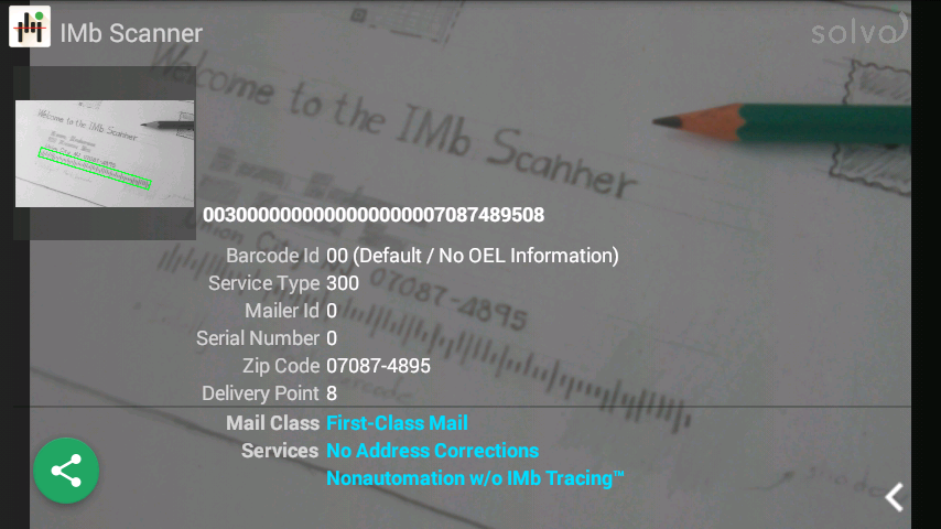 IMb-Scanner ist eine kostenlose App, die Ihre Smartphone- / Tablet-Kamera zum Scannen von USPS Intelligent Mail Barcodes (IMb) auf Briefumschlägen verwendet.