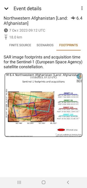 Für schwere Erdbeben wird ein Szenario der erwarteten permanenten Verschiebungen – basierend auf Herdmechanismen – erstellt, zusammen mit Informationen zu Satellitenerfassungszeiten und -abdeckung. Diese Details sind hilfreich, um den Zeitaufwand für die Berechnung der finiten Quelle abzuschätzen. Szenarien und Satellitenabdeckungsinformationen werden, sofern verfügbar, nach dem Ereignis nahezu in Echtzeit generiert.