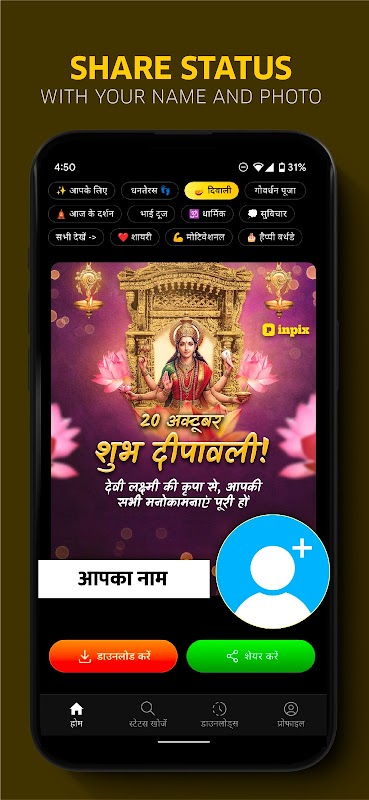 Entdecke Zitate über das Leben, Feste, die indische Kultur, hinduistische Götter und Göttinnen, berühmte Persönlichkeiten, große Philosophen und Schriftsteller – alles als personalisierte Statusmeldungen mit deinem Namen und Foto. Wir beschränken uns nicht nur auf Fotos: Erhalte alle Arten von Videostatus-Inhalten exklusiv auf InPix. Du brauchst keine andere Fotobearbeitungs-App, um ein Zitat zu einem Bild hinzuzufügen – einfach antippen und teilen.