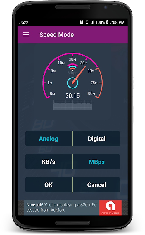 Internet Speed Test application is very easy to use and show quickly speed result. Just click start button and check DOWNLOAD and UPLOAD speed. You can change speed mode like ANALOG, DIGITAL, KB/sec and MB/sec. See results of all speed modes. You can also check your previous internet speed results and edit or delete results also share your internet speed results for social media sites and friends. At the end you can check complete result your internet speed test with DATE, TIME, ANALOG, DIGITAL, KB/S and MBP's.