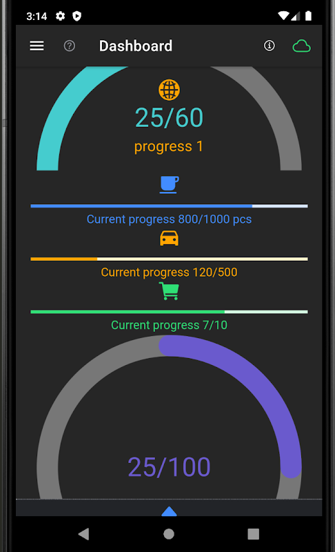 Widgets: Kipp-, Reichweite, Abzeichen, Power-Taste, fillgauge, Display-Wert, einfach-btn, anydata, Stahl