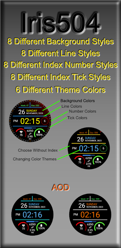 Iris504 ist eine Digitaluhr, die einfach und funktional ist und viele farbenfrohe Optionen bietet. Das Zifferblatt zeigt Tag, Datum, Monat und Jahr an. Die Uhrzeit wird entweder im 12-Stunden- oder 24-Stunden-Format angezeigt und automatisch durch die Zeitformateinstellung Ihres Smartphones eingestellt. Batterieprozentsatz, Herzfrequenz und Schrittzahl werden angezeigt. Die Entfernung wird je nach Herkunftsland in Meilen oder Kilometern angezeigt. Es stehen 8 benutzerdefinierte Hintergrundfarbstile zur Auswahl. Es gibt auch 8 Linienfarbstile. 8 Farben für Indexnummern und 8 Farben für Indexhäkchen zum Kombinieren. Die 6 Farbthemen bieten Ihnen Auswahlmöglichkeiten, die zu Ihrer anderen Auswahl passen. Die meisten Sprachen werden unterstützt. Einzelheiten finden Sie im Funktionsleitfaden.