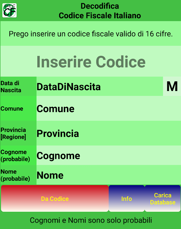 Italienische Steuernummer zu decodieren. Geburtsort und Datum Name dürfte