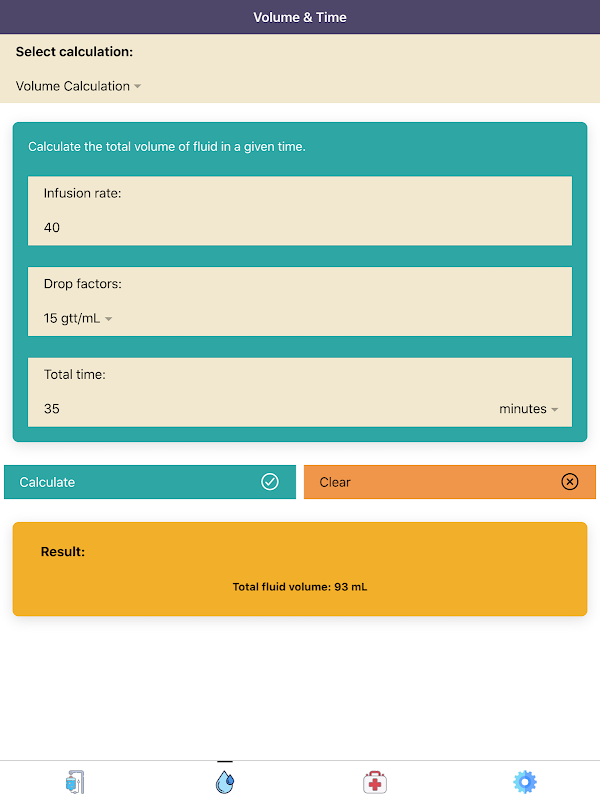 In der Funktion "Volumen & Zeit" kann der Benutzer zwischen "Volumenberechnung" oder "Zeitberechnung" umschalten. Die "Volumenberechnung" ermöglicht es dem Benutzer, das Gesamtvolumen der intravenösen Flüssigkeiten zu berechnen, das in einer bestimmten Zeit verabreicht wird "Zeitberechnung" ermöglicht es dem Benutzer, die Zeitdauer zu berechnen, die benötigt wird, um das gegebene Volumen an Flüssigkeiten, Medikamenten, Medikamenten oder Dosierungen zu verabreichen.