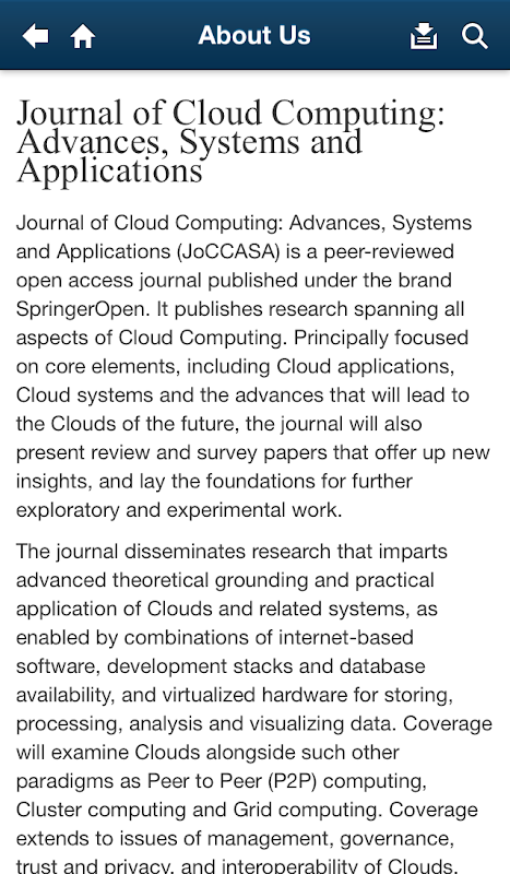 Tap into the most recent developments in the field of Cloud Computing with the Journal of Cloud Computing app. The Journal of Cloud Computing: Advances, Systems and Applications is a peer-reviewed open access journal published by Springer Science+Business Media. The Journal publishes original articles that cover all aspects of of Cloud Computing including Cloud applications, Cloud systems and the advances that will lead to the Clouds of the future.