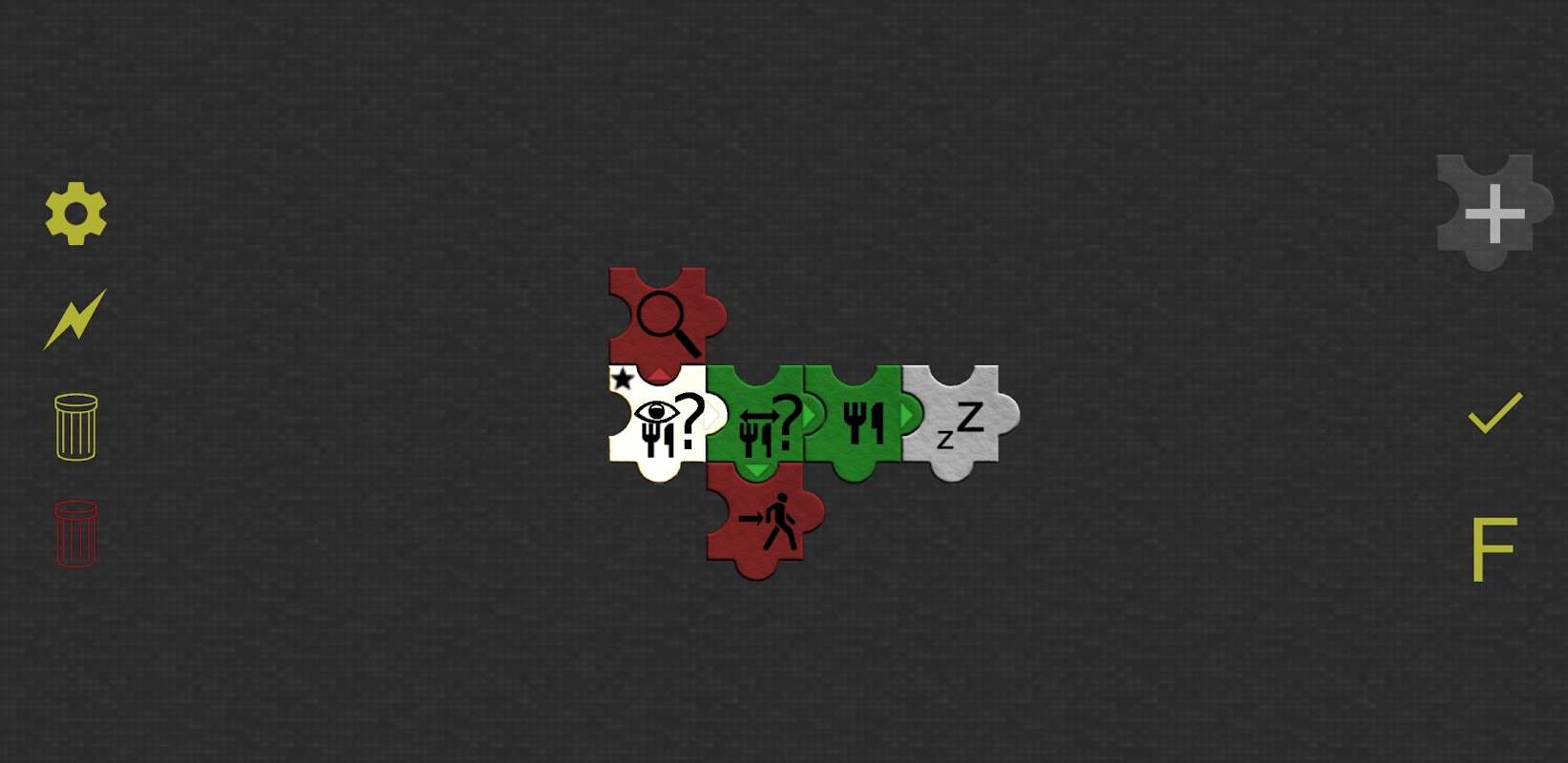 Außerdem hast du Befehle (in Form von Puzzleteilen): Gehe nach links, gehe nach rechts, esse, trinke, schlafe, greife an, baue und viele mehr.