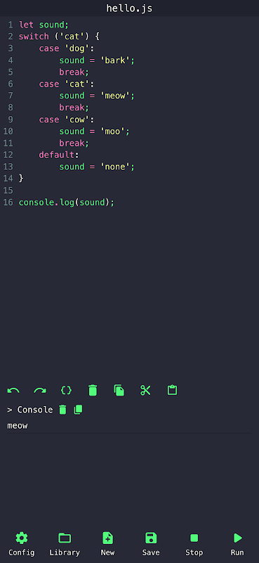 Minimalistischer JavaScript-Code-Editor, mit dem Sie Konsolenskripts unterwegs von Ihrem Mobilgerät aus ausführen können.