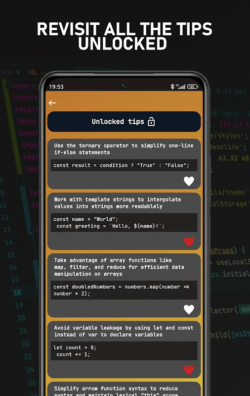 📚 Tippverlauf: Sehen Sie sich alle Tipps an, die Sie bereits freigeschaltet haben, und erweitern Sie so nach und nach Ihre Kenntnisse und Ihr Verständnis der Javascript-Sprache.