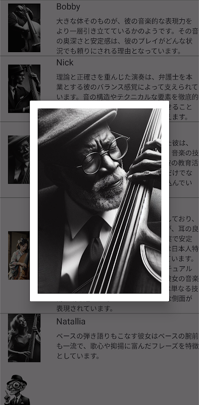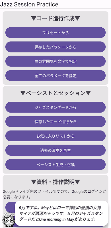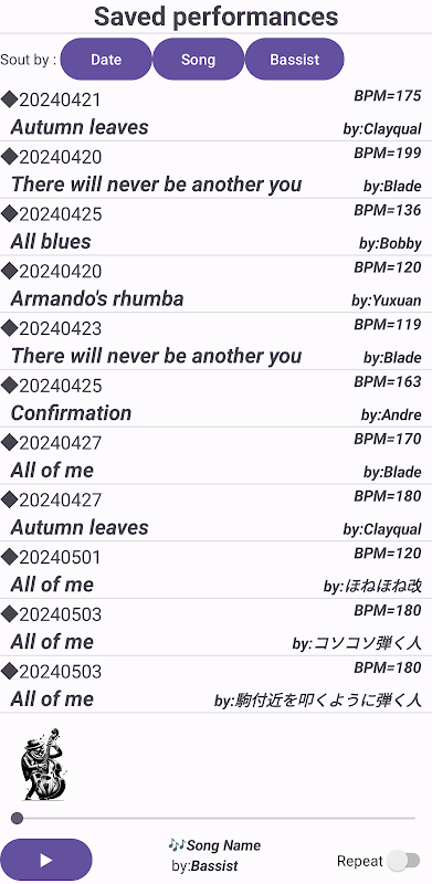 ③Sie können Sitzungen mit Bassisten haben, die über 100 verschiedene Eigenschaften (Gewohnheiten) haben. Zusätzlich zu den in ① und ② erstellten Akkorden können Sessions mit Jazz-Standardnummern (mehr als 150 voreingestellte Songs) durchgeführt werden.