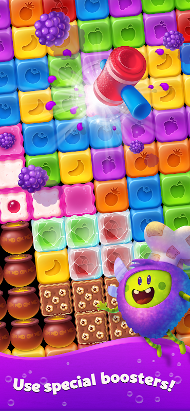 – Kombiniere Jelly Cubes, um mächtige Booster zu erstellen und köstliche, herausfordernde Blocker (wie Brombeeren, Lakritze, Lebkuchen und vieles mehr) zu zerstören!