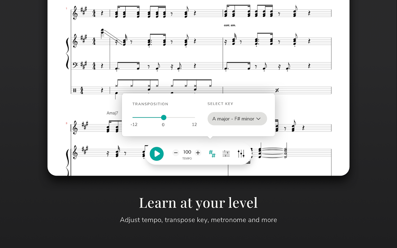Unsere Noten werden mit interaktiven Werkzeugen geliefert: Wiedergabe, Tempoeinstellung, Transposition, Tab / Notes-Umschalter und Bandmodus. Wir fügen häufig neue Funktionen hinzu, um den Bedürfnissen von Musiklernenden gerecht zu werden.