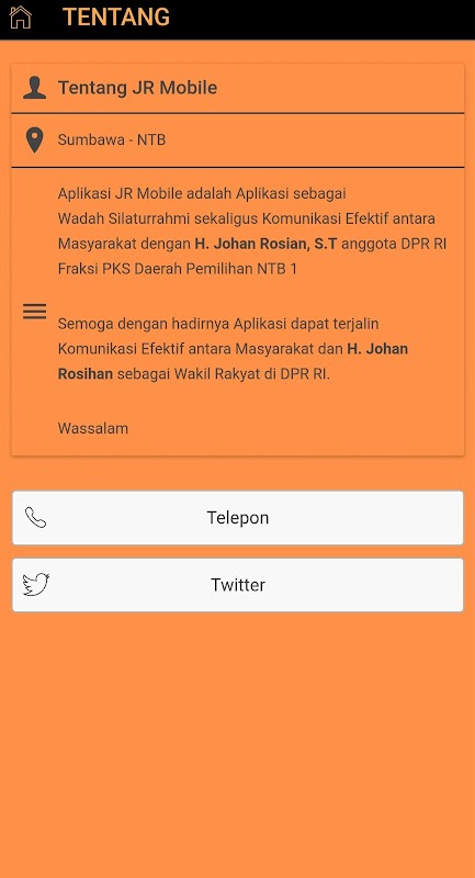 Die JR Mobile-Anwendung ist eine Anwendung als Forum für Freundschaft und effektive Kommunikation zwischen der Community und H. Johan Rosian, S.T., einem Mitglied des DPR RI der PKS-Fraktion im Wahlbezirk von NTB 1
