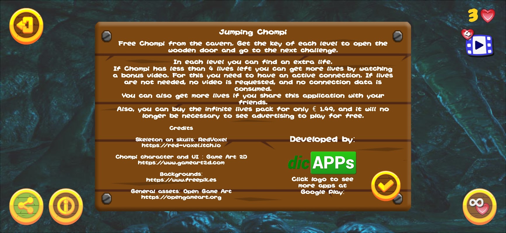 In jedem Level findest du ein Extraleben. Wenn Chompi nur noch wenige Leben übrig hat, kannst du mehr bekommen, indem du dir ein Bonusvideo anschaust. Dazu benötigen Sie eine aktive Verbindung.