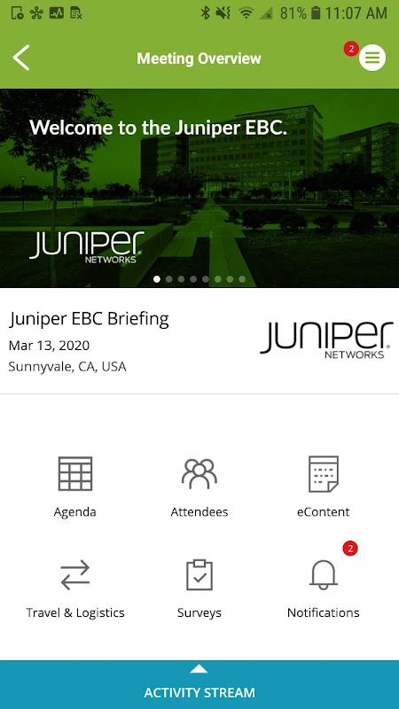 Die Juniper EBC App ist die perfekte App für Ihre wichtigen Executive Briefing Center (EBC) Meetings. Die App bietet einen zentralen Ort für Juniper-Mitarbeiter, Kunden und Meeting-Teilnehmer, um anstehende Besprechungen oder Besprechungen im Executive Briefing Center zu sehen, Raumnamen, Karten, Tagesordnungspunkte, Präsentator-Bios, Reise- und Logistikoptionen zu erhalten. Das robuste Benachrichtigungssystem informiert die Teilnehmer über Raumänderungen, eContent-Updates und mehr. Integrierte Umfragen ermöglichen es Benutzern, Feedback direkt in der App zu geben.