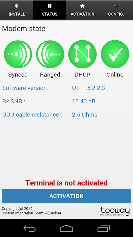 Die Anwendung erfordert ein drahtloses Netzwerk zwischen Tooway-Modem und Ihrem Smartphone. Sie können es für einen Mini-Router WIFI Sie das USB-Modem-Anschluss für Strom Blanchez verwenden.