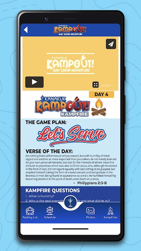 Das offizielle KampOut! App ist vollgepackt mit allen Informationen, die Sie benötigen, um Ihren Kamper für die beste Woche aller Zeiten vorzubereiten! Sehen Sie ganz einfach, wo wir diesen Sommer sein werden, und registrieren Sie sich direkt in der App. Erfahren Sie mehr über die Kanakuk-Mitarbeiter, sehen Sie sich Zeitpläne und Packlisten an und sehen Sie sich sogar die täglichen Kampfires an, die Ihnen einen Einblick geben, was Ihr Kind lernt, während es sich auf sein Kanakuk-Day-Kamp-Abenteuer begibt. Sie können auch tägliche Fotos direkt in der App ansehen!