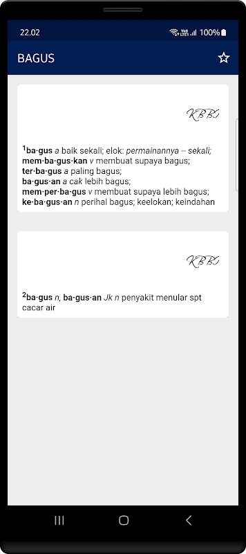 Die Anwendung Big Indonesian Dictionary (KBBI) ist das offizielle ekalinguale KBBI-Wortwörterbuch in indonesischer Sprache, das von der Language Development and Development Agency zusammengestellt und von Balai Pustaka veröffentlicht wurde. Diese KBBI-Wörterbuchanwendung kann als Hauptreferenz für Standard-Indonesisch verwendet werden und hilft Ihnen, indonesische Wörter mit einer Sammlung von KBBI-Wörtern mit guter und vollständiger Rechtschreibung von KBBI-Indonesisch-Wörtern zu finden.