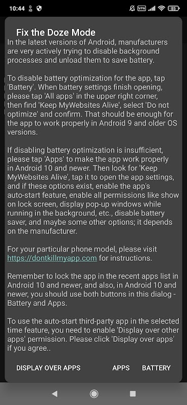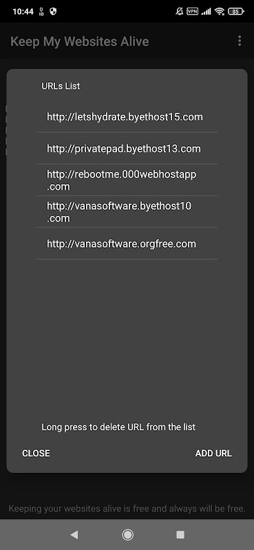 Der Zweck dieser App besteht darin, Ihre Websites regelmäßig mehrmals am Tag zu besuchen und so die Anzahl der Zugriffe auf mehrere Hundert pro Monat zu halten, was ausreichen sollte, um zu verhindern, dass Ihre Website auf kostenlosen Servern gelöscht wird.
