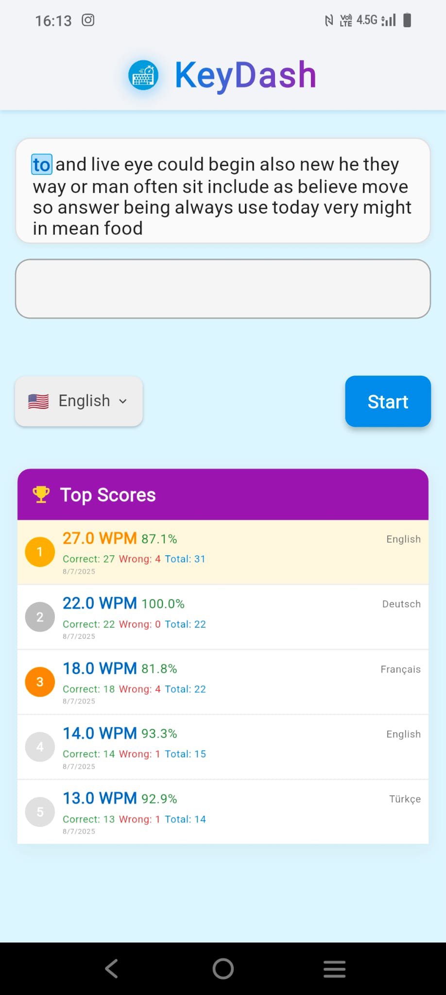 Mit dieser Tastaturtest-App können Sie Ihre Schreibgeschwindigkeit messen, die Tastaturleistung analysieren und Ihre Fortschritte verfolgen. Die App ermöglicht es Ihnen, sowohl Ihre Eingabegeschwindigkeit als auch die Reaktionszeit der Tasten zu testen.