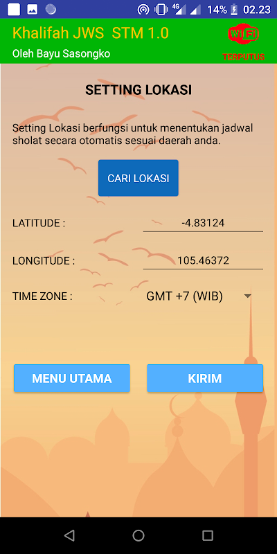 KHALIFAH JWS STM 1.0 adalah aplikasi yang digunakan untuk melakukan setting pada kontroller Jadwal Waktu Sholat dengan koneksi Wireless WIFI. Nama SSID WIFI Default : KHALIFAH JWS STM, Password Default : 123456789. Silahkan laporkan jika ditemui bug di aplikasi ini.