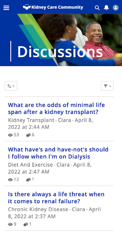 durch ähnliche Erfahrungen. Durchsuchen Sie die Themen und erfahren Sie mehr über gesunde Ernährung, Bewegung, Reisen, Behandlungsmöglichkeiten und mehr. Finden Sie Ressourcen zur Unterstützung von Dialysepatienten und Menschen mit Nierenerkrankungen, einschließlich Betreuern und Familien. Stellen Sie Fragen und beteiligen Sie sich an Diskussionen zu den Themen, die Sie interessieren. Verbinden Sie sich mit Community-Mitgliedern einzeln oder in Gruppen. Durchsuchen Sie unseren Veranstaltungskalender nach nierenbezogenen Veranstaltungen.