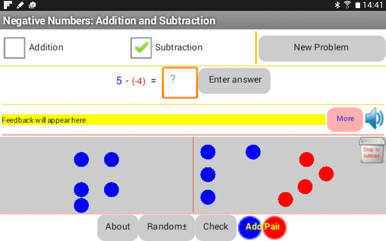This app provides a platform for students to play with the ideas of negative numbers, including both addition and subtraction. The primary assumption is that, for any positive number, such as 1, there is an inverse, -1, with respect to addition, so that 1 + (-1) = 0. Zero is usually called the additive identity; the inverses are called additive inverses. In the app, a blue ball represents a positive one; a red ball represents a negative one. A blue ball plus a red ball thus results in zero, namely, they cancel out when they come close to each other. This is a useful strategy to learn and teach the big ideas behind negative numbers.