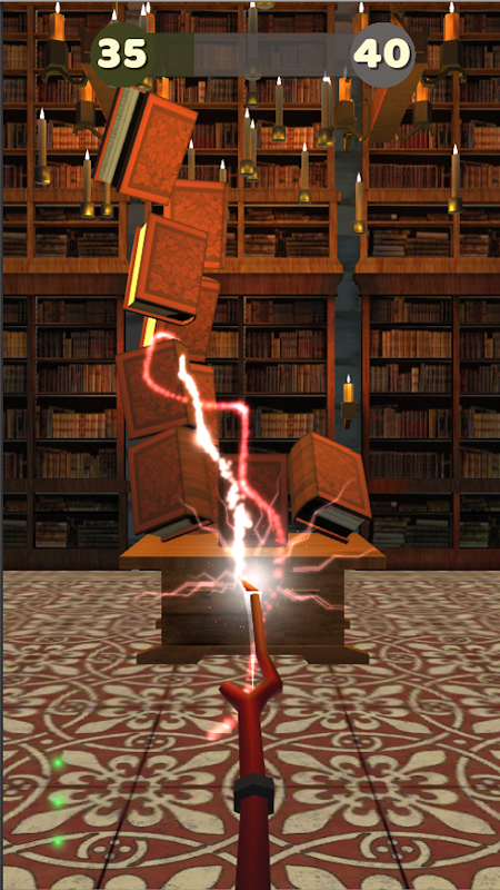 ZERSTÖRE ALLE BÜCHER, UM ZUM NÄCHSTEN LEVEL ZU GEHEN. Berühre, um Zauber aus deinem Zauberstab zu schießen und die magischen Bücher zu treffen. Stelle sicher, dass alle Bücher umgeworfen und zerstört wurden. Vorsicht, wenn nicht alle Bücher umgeworfen wurden und du keine Zauber mehr wirken kannst, musst du zu deinem vorherigen Kontrollpunkt zurückkehren.