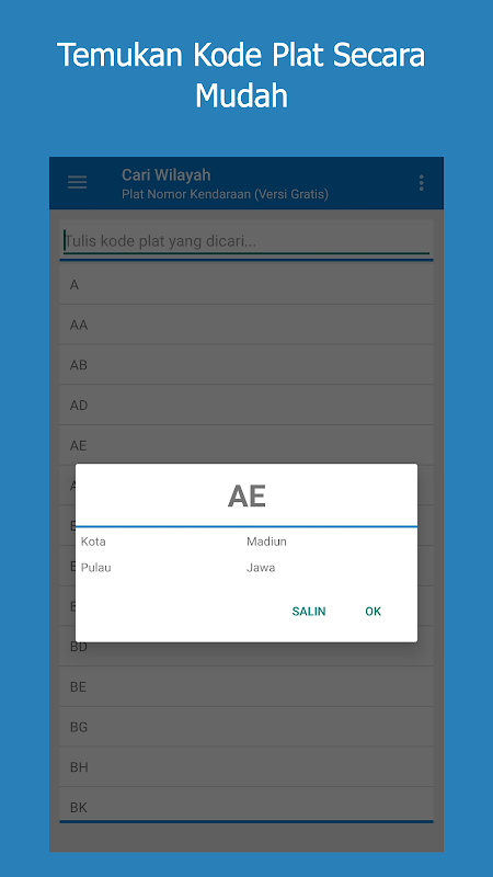 ✓ Dapat mencari kode plat berdasarkan wilayah