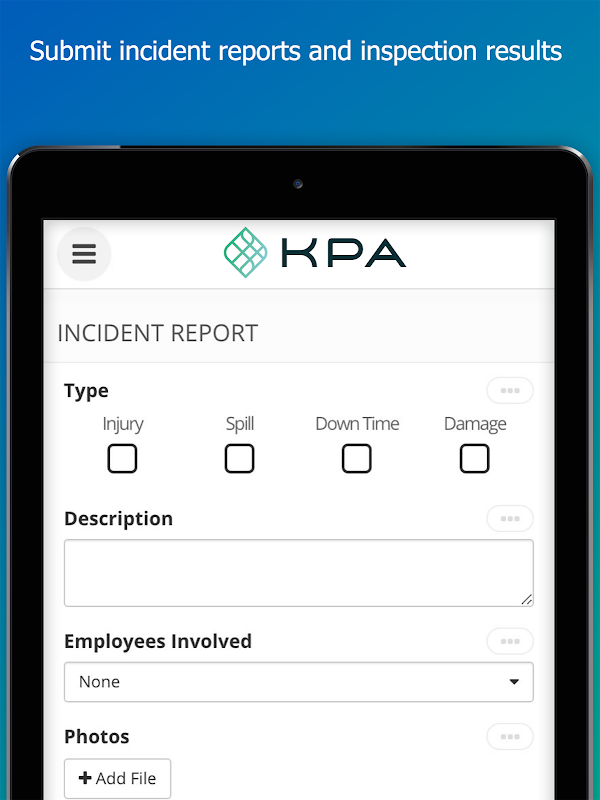 KPA Flex ist eine benutzerfreundliche, hochgradig konfigurierbare und leistungsstarke Plattform zur Verwaltung aller Aspekte Ihres Umwelt-, Gesundheits- und Sicherheitsprogramms (EHS). Mit der mobilen App können mobile Mitarbeiter schnell und einfach Inspektionen verwalten, Vorfälle aufzeichnen und verfolgen, Schulungen absolvieren und vieles mehr.