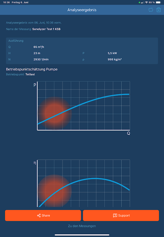 Das Ergebnis wird sogleich auf dem Display angezeigt, so z.B. dass die Pumpe und der Motor jeweils in Teillast betrieben werden. Sie können direkt Beratung zu Ihrer individuellen Analyse anfordern, wobei der lokal zuständige KSB-Ansprechpartner nahtlos an Ihre Analyse anknüpfen kann.