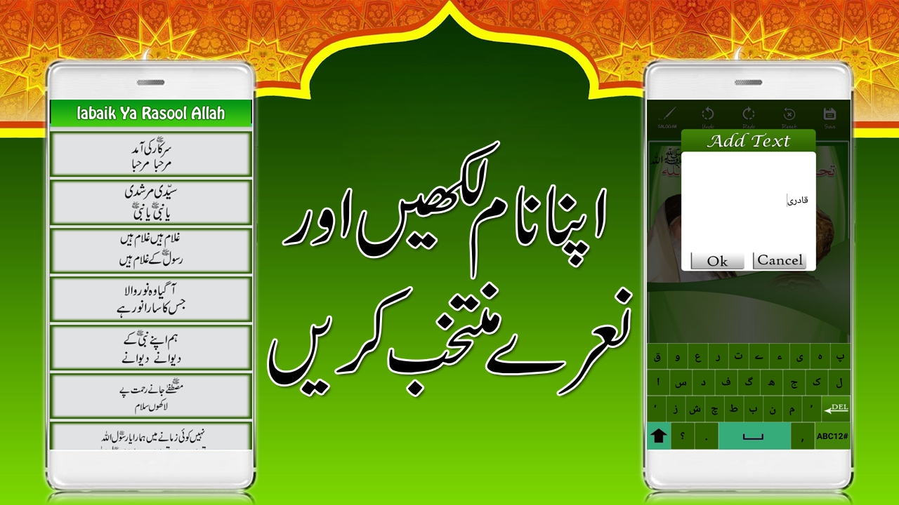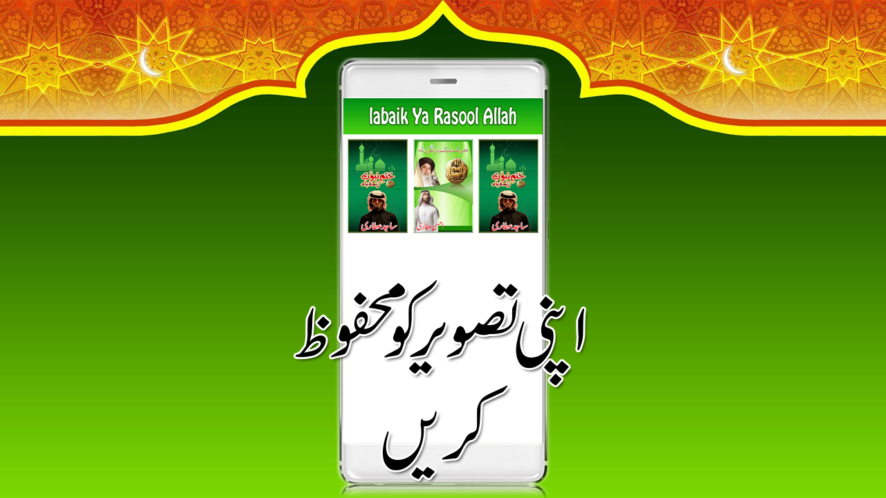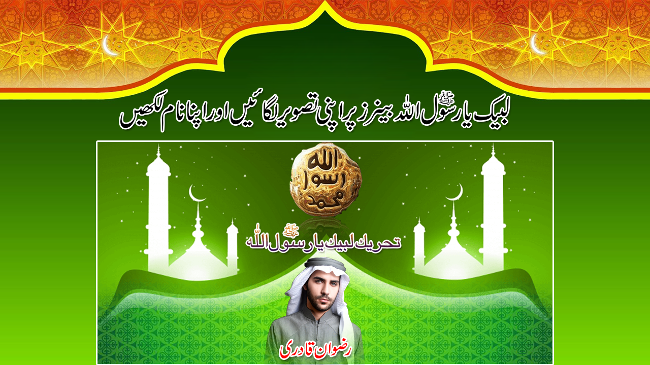 at home very easily with your photo and name and Labaik Ya Rasool Allah salogan you can also write your