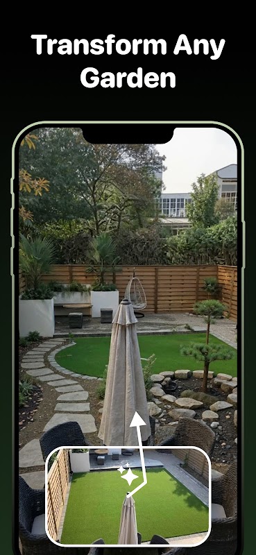 Verwandeln Sie jeden Außenbereich sofort mit KI-Gartendesign. Landschaftsplaner-App für virtuelle Landschaftsgestaltung, Pflanzenauswahl und Hofmakeover. Foto aufnehmen, Stil wählen und Ihr Garten-Redesign in Sekunden sehen.