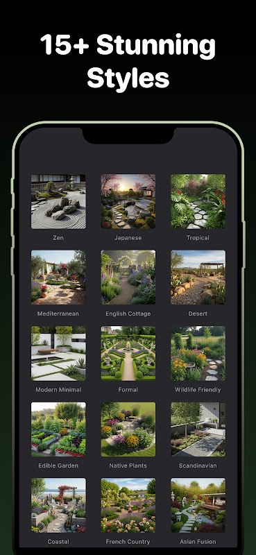 Englisches Gartendesign, japanische Zen-Landschaft, moderner minimalistischer Hof, Cottage-Gartenplaner, mediterrane Landschaftsgestaltung, Wüsten-Xerophyten-Garten, tropische Paradies-Landschaftsgestaltung, einheimisches Pflanzengartendesign, formale Gartenlandschaft, Wildtier-Habitat-Garten, Gemüsegarten-Planer-Stile.
