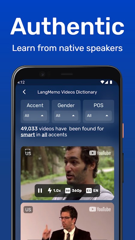• Multiple accents: It doesn't matter which accent you are learning! LangMemo contains more than 100 Million videos divided into 7 accents (UK, US, AUS, CA, IE, SCO, and NZ).
