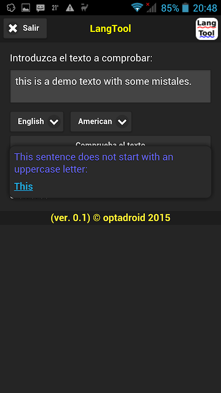 Wählen Sie unter mehr als zehn verschiedenen Sprachen, geben Sie einen Text, um zu überprüfen und das Programm wird es dem Languagetool-Server zur Überprüfung schicken. Mistaken Begriffe oder Ausdrücke werden hervorgehoben und Korrekturvorschläge zur Verfügung gestellt.