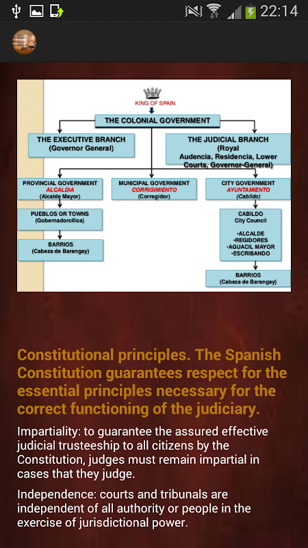 Elegant application full of details and information about the law in Spain, how the court system in Spain is organice, court officials and the rank of police.