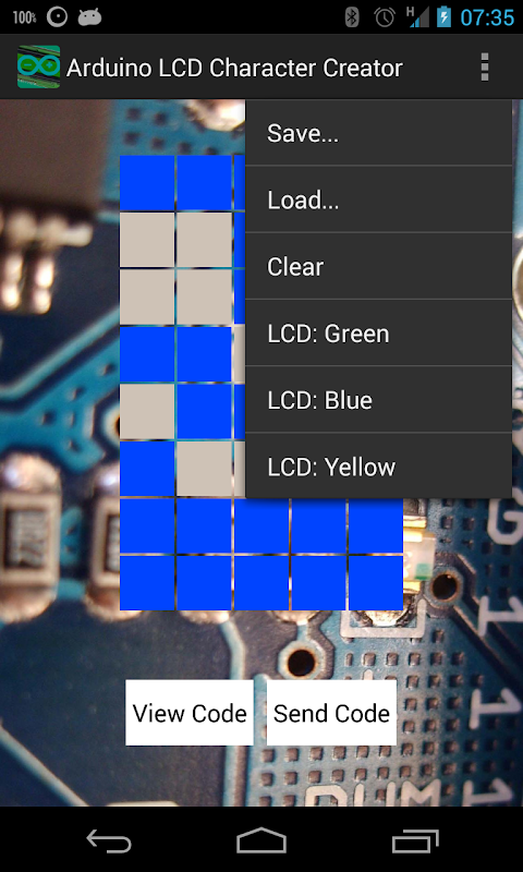 The LCD for Arduino app will allow you to create custom LCD characters for your Arduino projects. Are you tired of the boring common characters and want your project to stand out from the others? Then this is for you. It features three different colors (blue, green, and yellow), an easy way to save your creations to your device, load them from the device, and even share them via email. The app automatically generates Arduino C code that is ready to paste into your Arduino software, compile, and display your custom creations with ease.